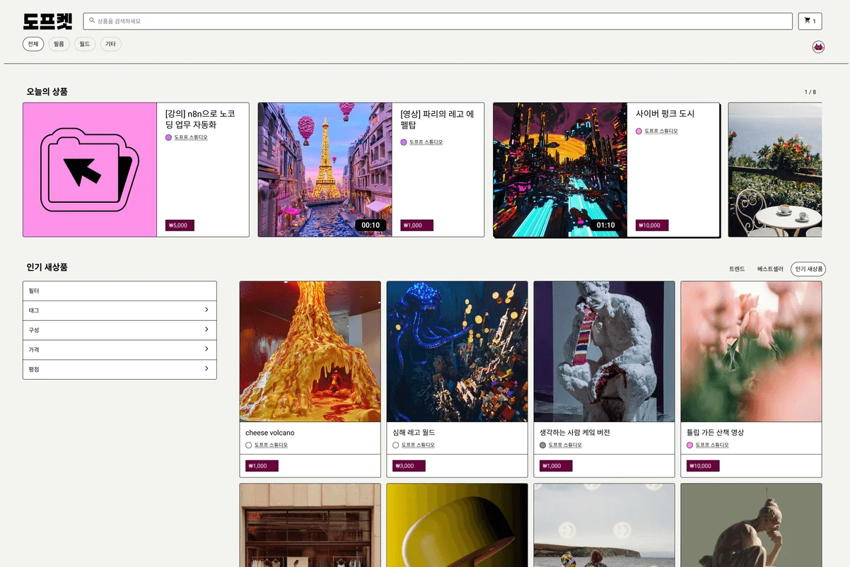 도프켓은 기존 디지털 에셋 마켓의 복잡한 절차와 높은 장벽을 낮춘, 크리에이터에게 최적화된 디지털 에셋 오픈 마켓입니다. 누구나 쉽고 빠르게 창작을 수익으로 연결할 수 있는 환경을 제공합니다.